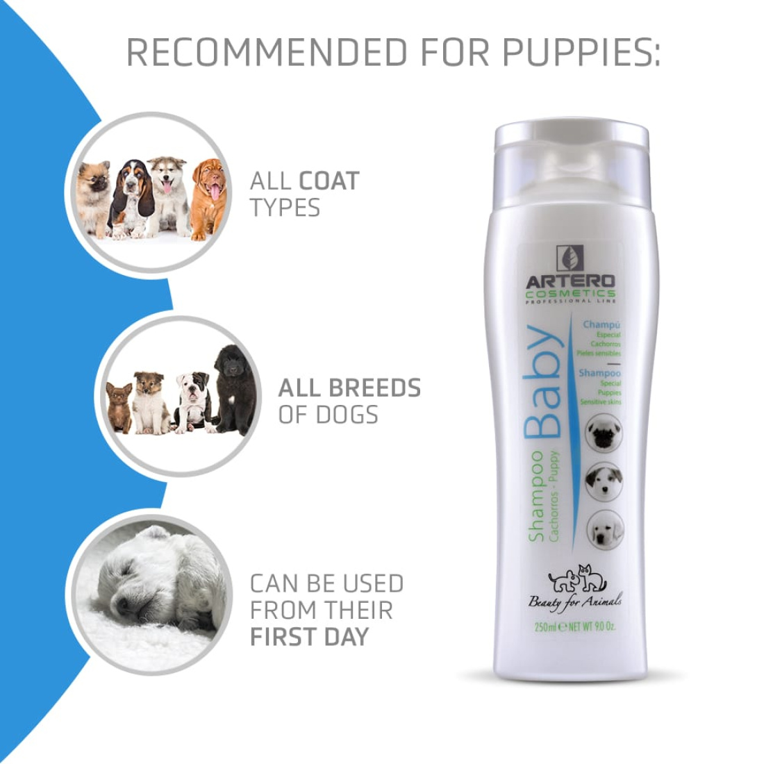 Artero Baby Shampoo ist speziell für Welpen im Alter von 1 bis 8 Monaten entwickelt. Ihr Fell und ihre Haut sind in dieser Entwicklungsphase besonders empfindlich und benötigen daher zusätzliche Pflege.