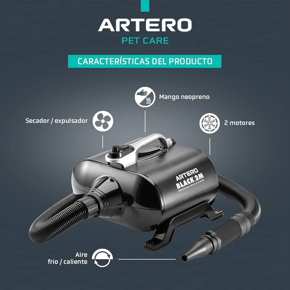 Artero Black 2 Motoren Blower für die Hundepflege. Trocknet Hundefell schnell und professionell. Ausstattung: Blower mit 2 Motoren. Die 2 Motoren arbeiten immer gleichzeitig. Luft- und Wärmestromregler. Maximaler Luftstrom: 320 CFM. Leistung: 3000 W. Maximale Temperatur: 52 °C. Maximale Lautstärke bis 85 dB. Inklusive ausziehbarem Schlauch von 70 cm auf 2 Meter. Enthält ein Set mit 3 Mundstücken. Filter leicht zu entfernen und zu reinigen. Abmessungen: Höhe: 26 cm. Breite: 34 cm. Länge: 38 cm. Gewicht: 6,7 kg. Der Schlauch hat einen Neoprengriff, um uns vor der Hitze zu schützen. Achtung bei allen Hundeföhne die Kohlestifte alle 600-700 Betriebsstunden prüfen.