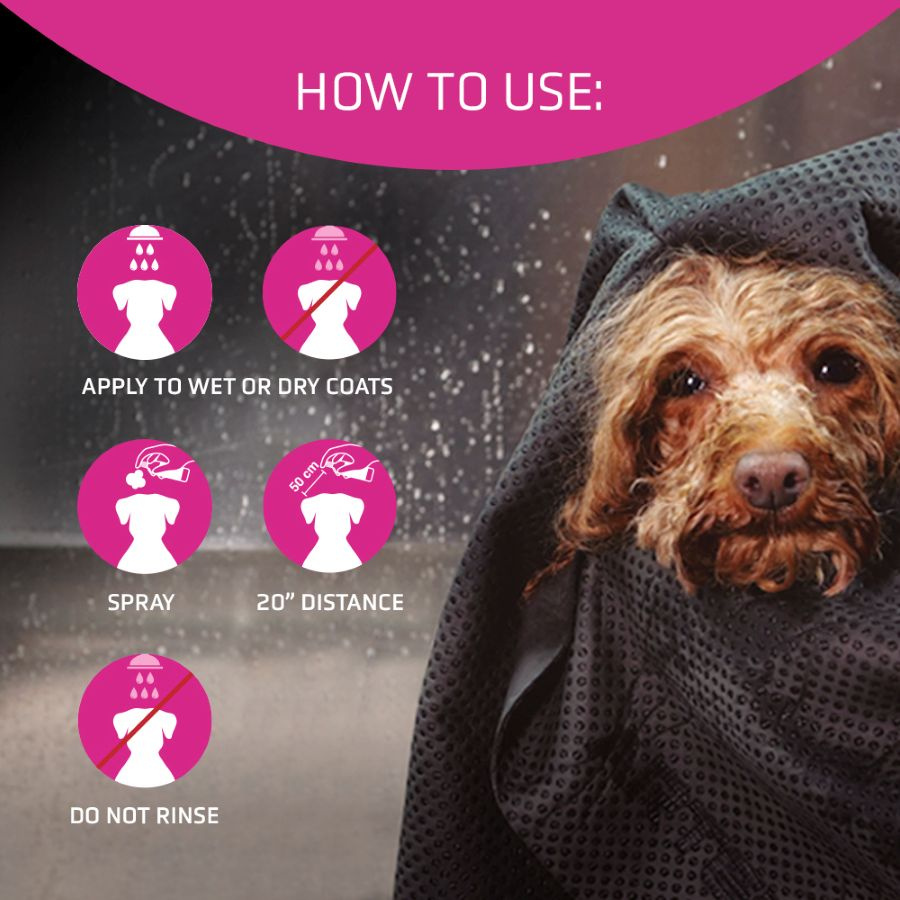 sprühen. Bürsten, um Knoten zu entfernen. Nicht ausspülen. Danach das Fell trocken föhnen.