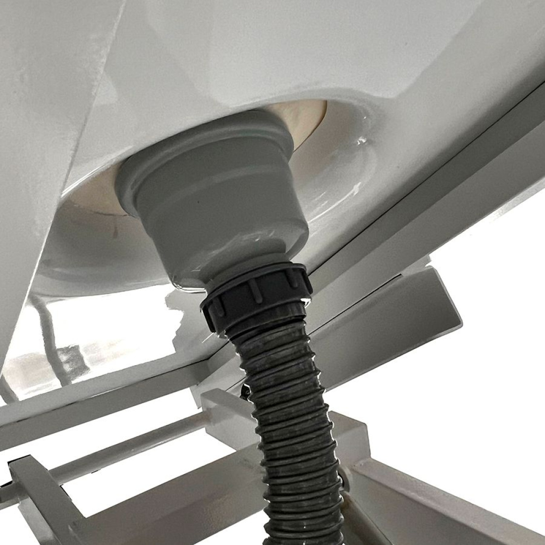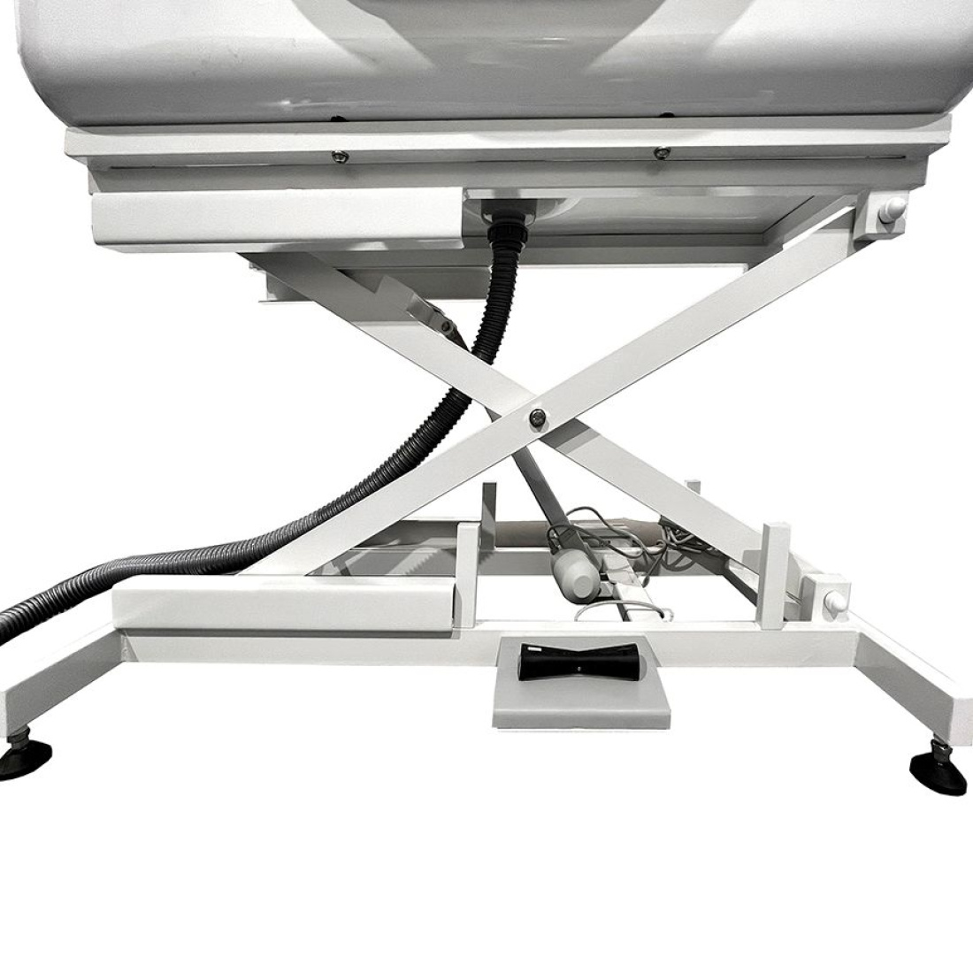 Nautische Haustierbadewanne aus Fiberglas Elektronische Höhenverstellung mittels Pedalen zur Anpassung der Höhe an die für den Hundefriseur optimale Höhe, je nach Größe des Tieres. Stahlstange zur Befestigung von Fluchtschutzgurten für Hunde und Katzen Abnehmbare zentrale Tür aus Kunststoff, um großen Hunden Zugang zu ermöglichen. Inklusive Kunststoffboden im Behälter, damit das Wasser schnell ablaufen kann. Hebebühne aus Kunststoff für bequemes Arbeiten mit kleineren Hunden und Katzen. Erhöhter Behälter an den Seiten und der Rückseite, um Spritzer zu vermeiden.