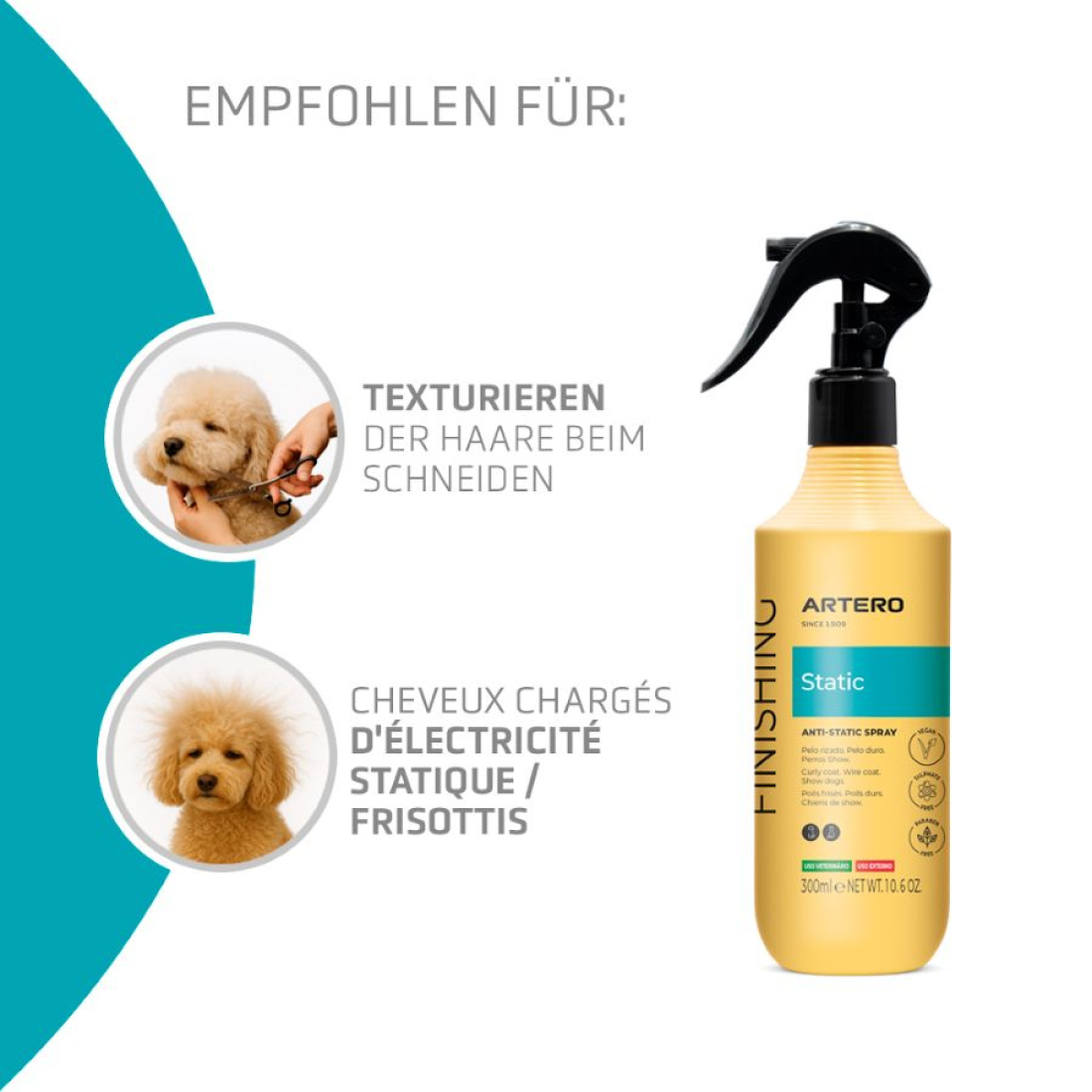 Artero Anti-Static Control ist ein speziell entwickeltes Spray für den professionellen Scherenschnitt, durch seine antistatische Wirkung lässt sich das Fell schnell schneiden, es verleiht Volumen und natürlichen Glanz. 150 ml Spray