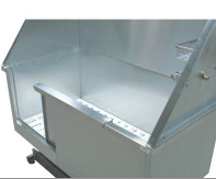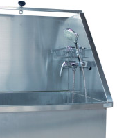 elektrische Edelstahl-Hundebadewanne – Einstieg links Absolute Qualität, mit Einlegematte fein und grob Inkl. Dusche, Armatur und Shampoo Ablage und Fönanschluss (ohne Fönschlauch) Breite – Außen 129cm Breite – Innen 121cm