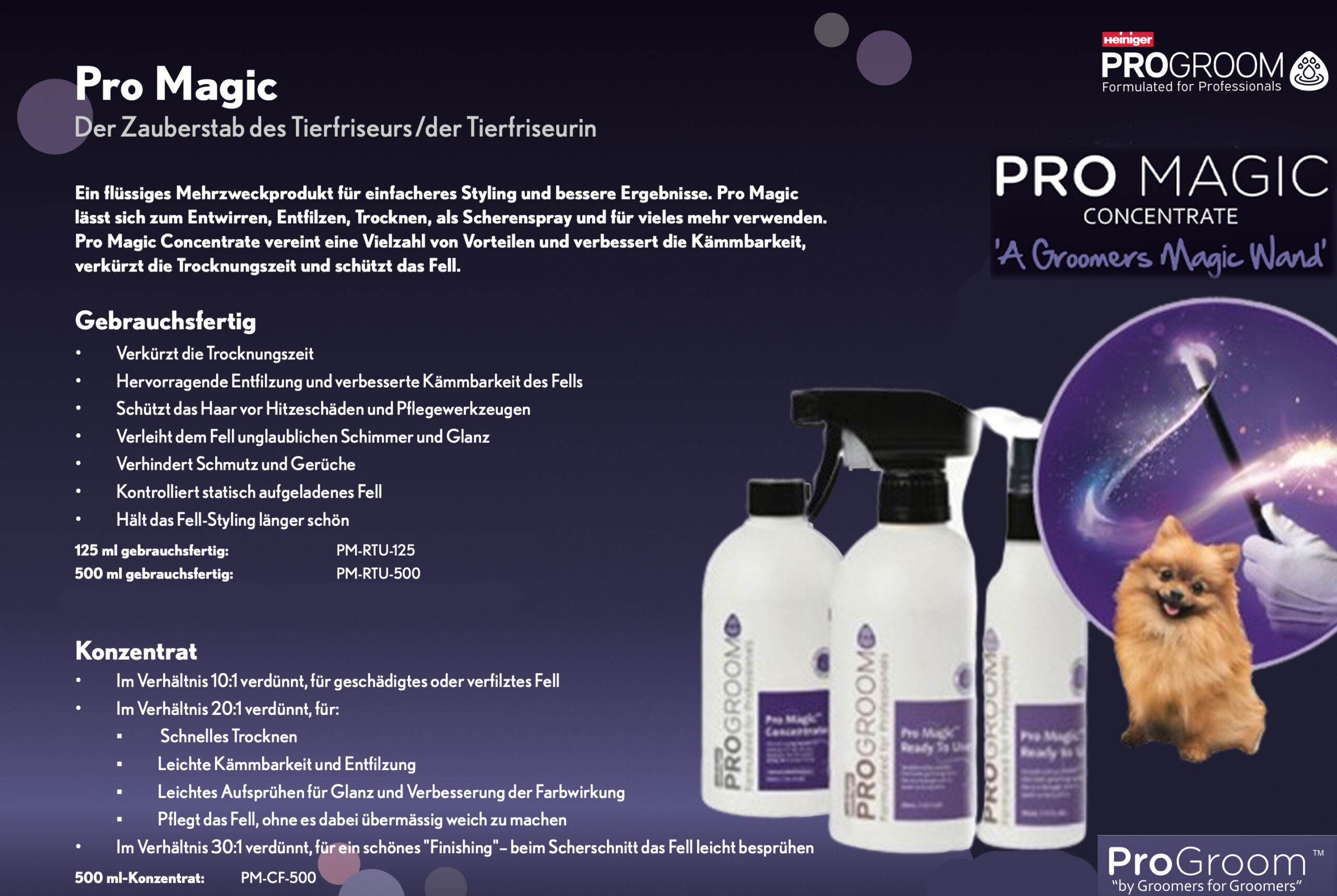 HEINIGER ProGroom Pro Magic Concentrate 500ml EINZELHEITEN: Ein vielseitiges flüssiges Werkzeug für einfacheres Styling und bessere Ergebnisse! Pro Magic Concentrate kann für verschiedene Pflegeaufgaben angepasst werden und bietet zahlreiche Vorteile, die das Styling erleichtern. Ideal für Hunde, Katzen und Pferde. Es ist der Zauberstab, von dem Friseure geträumt haben. VORTEILE: Erstaunliche Entwirrung und verbesserte Kämmbarkeit des Fells. Schützt das Haar vor Hitzeschäden und Pflegeutensilien. Verbessert die Zugfestigkeit der Haare. Verleiht dem fertigen Fell unglaublichen Glanz, und Glanz Verhindert Schmutz und Gerüche. Beschleunigt die Trocknungszeit. Steuert statische Aufladung. Behält den Stil länger bei! Wasserlöslich und baut keine Schichten auf oder bricht sie ab. Schnellere Pflegezeiten. Wirtschaftliches Konzentrat. Weniger Stress für Hundefriseur und Haustier PASSEND FÜR: Entfilzen, Enthaarung, Scherenspray, Stylinghilfe, Konditionierungsmittel, Trockenspray; Für Hunde, Katzen und Pferde