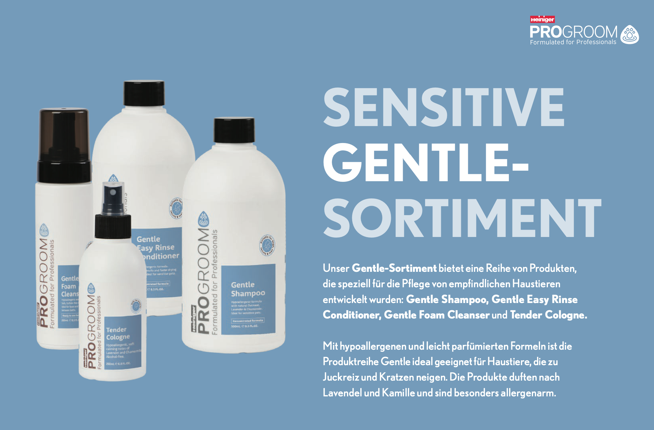 HEINIGER ProGroom Gentle 125 ml Sanftes & Hypoallergenes Shampoo für juckende und empfindliche Haustiere! EINZELHEITEN: Nährend und pflegend für Haustiere, die häufig jucken und kratzen. Ein mildes reinigendes und feuchtigkeitsspendendes Shampoo mit Haferflocken, Lavendel und Kamille – eine perfekte Kombination für Haustiere mit Empfindlichkeiten. VORTEILE: Pflegende Mischung für juckende Haustiere PASSEND FÜR: Am besten in Verbindung mit unserer Gentle-Reihe verwenden, die den Gentle Easy Rinse Conditioner und den Gentle Foam Cleanser umfasst. WIE BENUTZT MAN: Ultrakonzentrierte Formel Flasche vor Gebrauch schütteln. Die Verdünnung kann je nach gewünschtem Ergebnis variiert werden Zuerst Wasser hinzufügen, dann das Produkt dazugeben und gut schütteln. Verdünntes Produkt immer innerhalb von 24 Stunden verbrauchen! HANDANWENDUNG: Verdünnen Sie 1 Teil Shampoo mit 4 Teilen Wasser (die Verdünnung nach Fellzustand anpassen) Nasses Fell, verdünntes Shampoo auftragen und in das Fell einarbeiten, bis ein Schaum entsteht Gründlich mit frischem Wasser abspülen und den Waschvorgang bei Bedarf wiederholen. Verwenden Sie einen geeigneten Conditioner Trocknen Sie das Fell mit einem Handtuch oder Trockner. Haare bürsten oder kämmen HYDROBAD: Geben Sie zwischen 5 und 10 ml in den Vorratstank (2 x 30 ml-Pumpe) in Frischwasser im Vorratstank füllen SICHERHEITSASPEKTE: Lesen und befolgen Sie die Anweisungen stets sorgfältig, einschließlich aller Warnhinweise zur Verwendung Es ist wichtig, den Kontakt mit den Augen zu vermeiden Wenn ein Hund schielt oder sich die Augen reibt, spülen Sie ihn fünf Minuten lang vorsichtig mit lauwarmem Wasser aus Verdünntes Produkt immer innerhalb von 24 Stunden verbrauchen Produktlagerung: Wir empfehlen, beim ersten Öffnen eines Produkts das Öffnungsdatum auf die Flasche zu schreiben. Geöffnete Produkte müssen innerhalb der auf dem jeweiligen Flaschenetikett angegebenen Öffnungszeit verbraucht werden. Bewahren Sie die Produkte mit Deckel auf, wenn sie nicht verwendet werden, und verbrauchen Sie das Produkt innerhalb der empfohlenen Zeit. Vermeiden Sie die Lagerung Ihrer Produkte im direkten Sonnenlicht oder in der Nähe von Wärmequellen und wählen Sie nach Möglichkeit trockene, kühle Lagerorte. Alle Applikatoren und Verdünnungsflaschen regelmäßig gründlich waschen und sterilisieren Lassen Sie die Applikatoren vor der Verwendung gründlich trocknen.