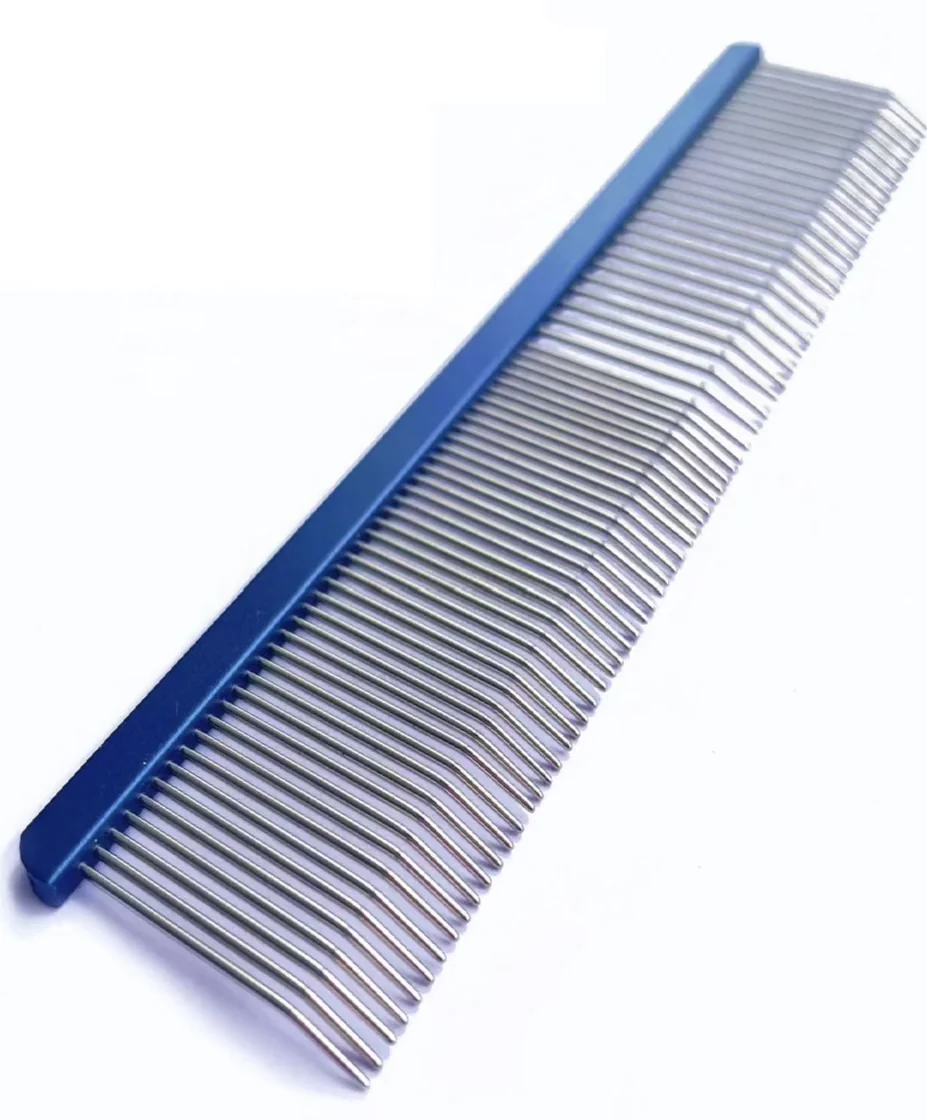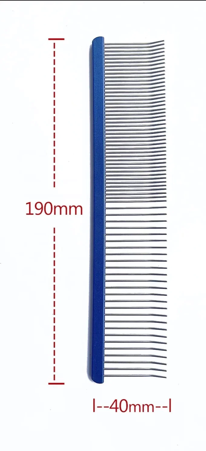 Griff aus gehärteter Aluminiumlegierung, 19,0 cm , blau abgerundete Stifte, gebogene Pins feine und starke Stahlzähne, polierte runde Spitzen, Dieser Kamm ist ein Profiwerkzeug, das perfekt für die leichtere Fellfplege ist. Mit seinen am Ende gebogenen Pins bekommt man mühelos das Fell für den perfekten Schnitt aufgekämmt. Ideal für Profis und Haustierbesitzer.