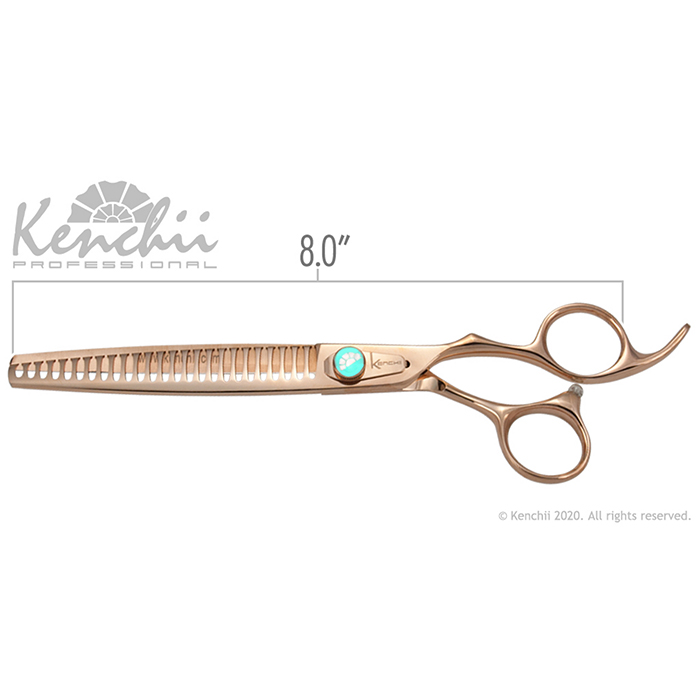 Kenchii Rose™ 25 Zähne Speedcutter 8.0″ Die Scheren von Kenchii Rosé werden aus unseren firmeneigenen japanischen Molybdän Materialien der Stufe 2 hergestellt, die mit rosé goldenem Titan überzogen sind. Die halbkonvexe, mikroverzahnte Kante reduziert den Schlupf und verbessert die Schneideleistung. Ideal für die tägliche Pflege. Lieferung mit Öl und Ringeinsatz. Model: KERO Rosé Gerade Scheren in : 7.0″ and 8.0″ Gebogene Scheren in : 7.0″ and 8.0″ Speedcutter in : mit 25 Zähnen 8.0″ Modelierschere: mit 54 Zähnen 7.5″