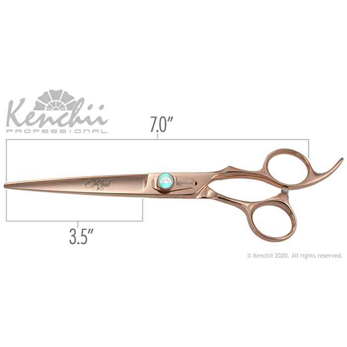 Kenchii Rose™ | 7.0″ gerade Schere Die Scheren von Kenchii Rosé werden aus unseren firmeneigenen japanischen Molybdän Materialien der Stufe 2 hergestellt, die mit rosé goldenem Titan überzogen sind. Die halbkonvexe, mikroverzahnte Kante reduziert den Schlupf und verbessert die Schneideleistung. Ideal für die tägliche Pflege. Lieferung mit Öl und Ringeinsatz. Model: KERO Rosé Gerade Scheren in : 7.0″ and 8.0″ Gebogene Scheren in : 7.0″ and 8.0″ Speedcutter in : mit 25 Zähnen 8.0″ Modelierschere: mit 54 Zähnen 7.5″