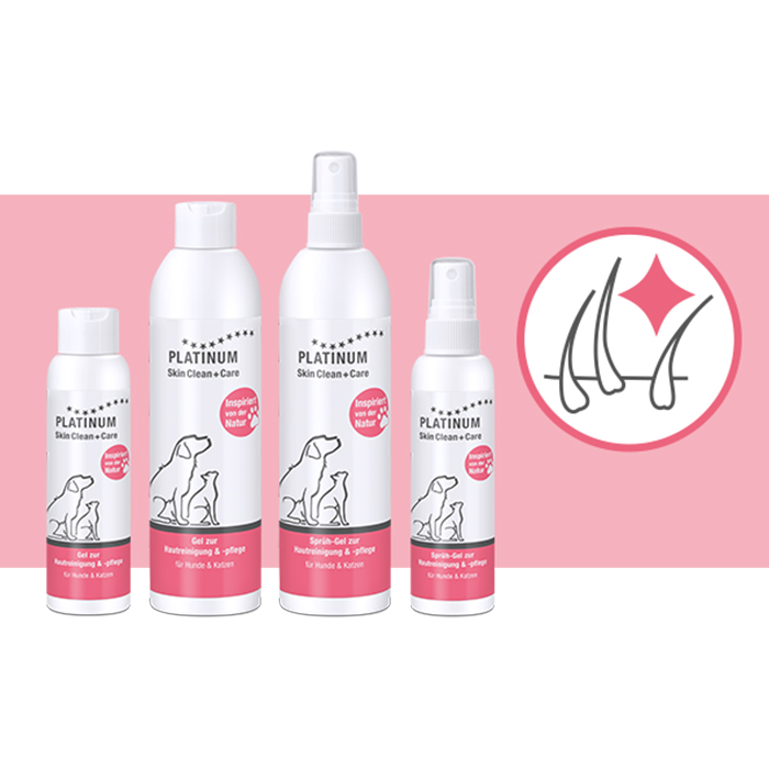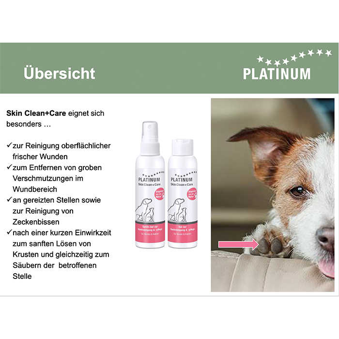 Um Wunden Ihres Hundes optimal behandeln zu können, sollten Sie zur Reinigung im Rahmen der Erstversorgung der Verletzung das Skin Clean+Care (Sprüh-)Gel immer griffbereit in Ihrer Haustier-Apotheke haben. Das Gel gibt es in zwei Varianten, die je einen unterschiedlichen Aufsatz haben. Je nach Charakter und Sensibilität des Hundes empfiehlt sich entweder der Tropfaufsatz oder die Variante mit Sprühaufsatz.