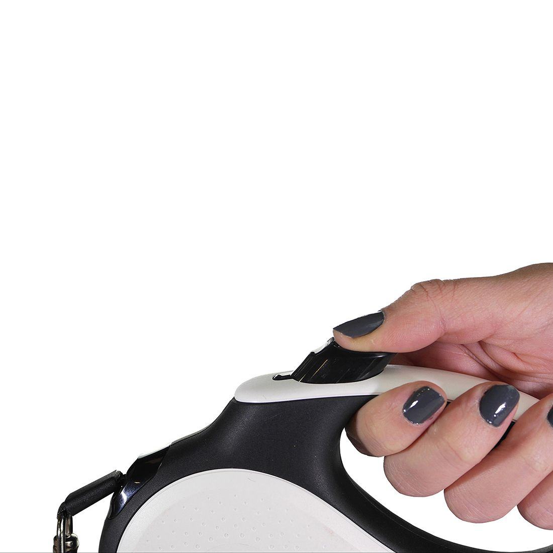 Rollleine Artero Dog-Control. Das sehr sichere und komfortable Bremssystem ermöglicht die Nutzung der Leine zur Kontrolle des Hundes. Die Bremse kann gelöst werden, sodass sich der Hund beim automatischen Einholen der Leine problemlos 360° um den Hund drehen kann, ohne dass sich die Leine verheddert. Eigenschaften: Maximales Hundegewicht: Bis zu 25 kg. Reichweite: bis zu 5 m. Sehr sicheres Bremssystem. Bremsentriegelungssystem. Griff und ergonomisches System. Leineneinzug: Automatisch. Neben der eleganten Schwarz-Weiß-Optik ist die ausziehbare Leine Artero Dog-Control dank ihrer hochwertigen Gummi- und Kunststoffoberflächen ergonomisch und angenehm in der Hand.